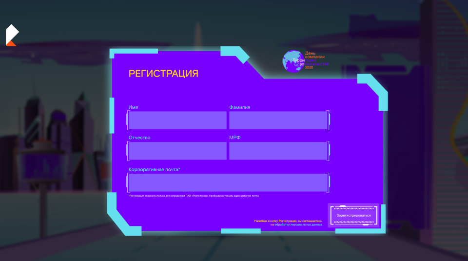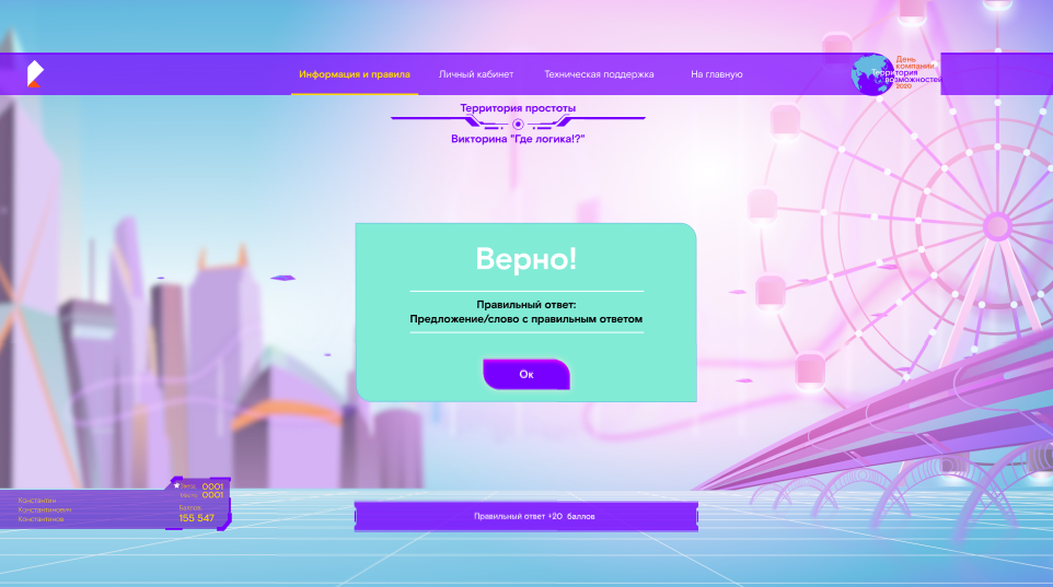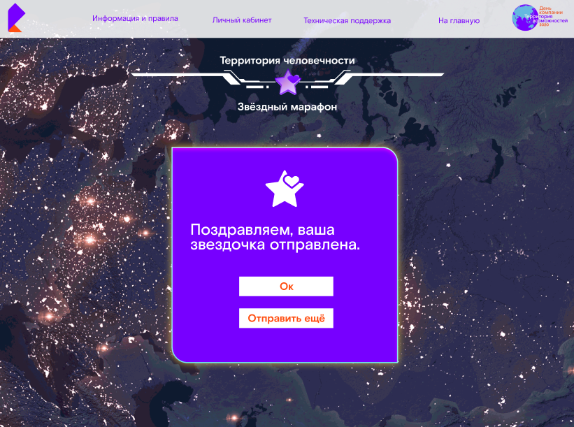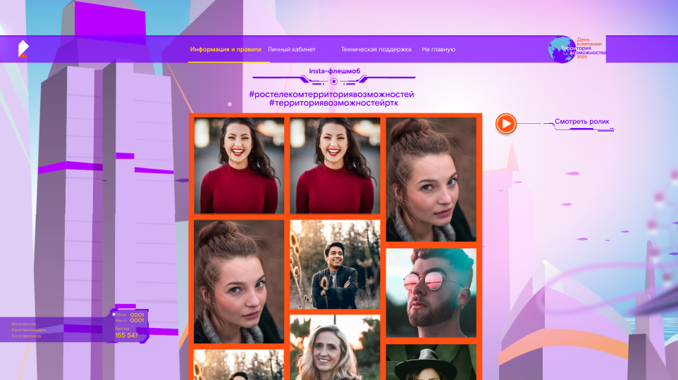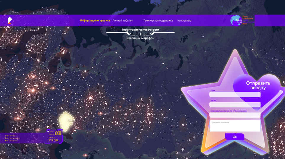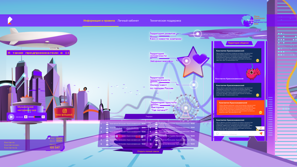 Chat, music playlist, copyright stickers, the ability to send stars (likes) to colleagues, which were summed up in your personal account and sent through an animated map of Russia to any city in the country, an insta-flash mob, 3 interactive locations with quizzes and valuable prizes.