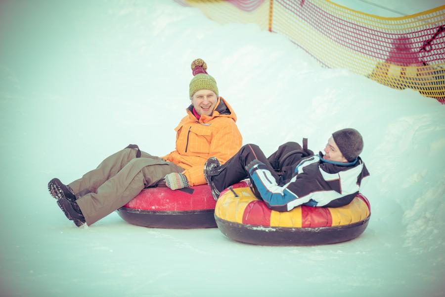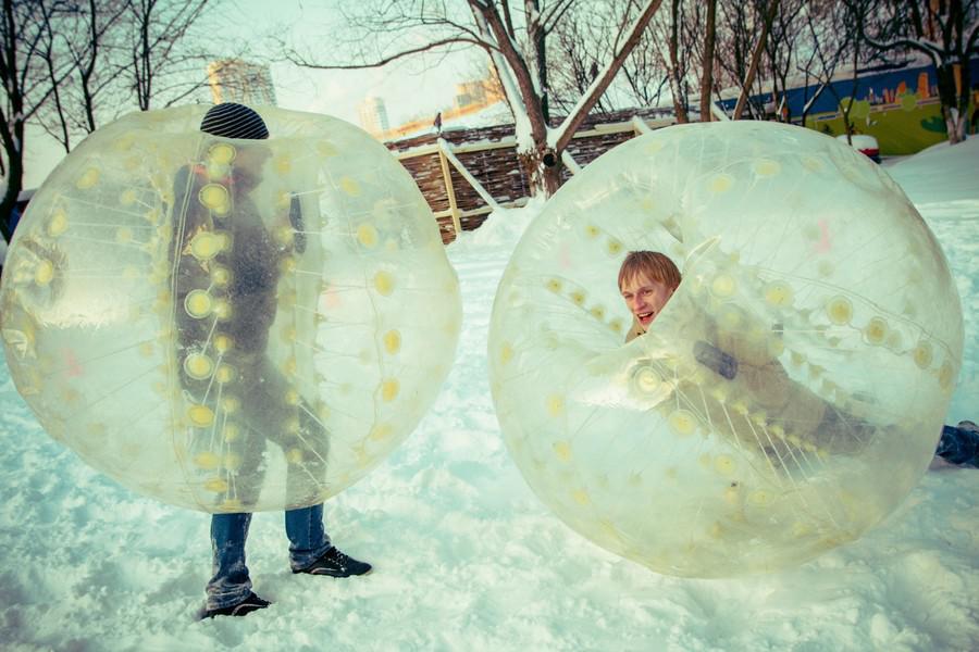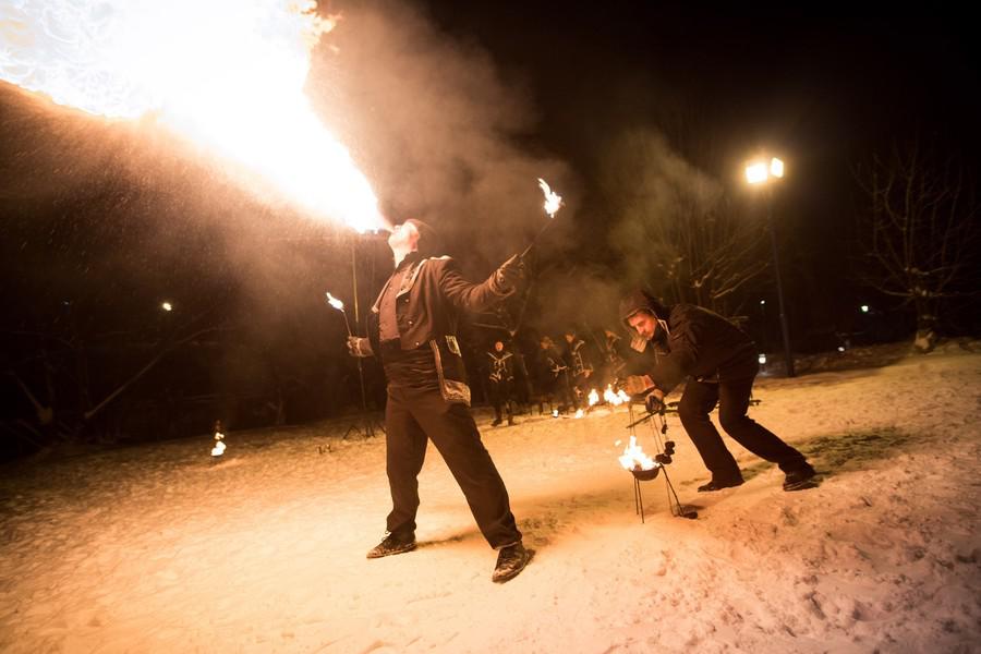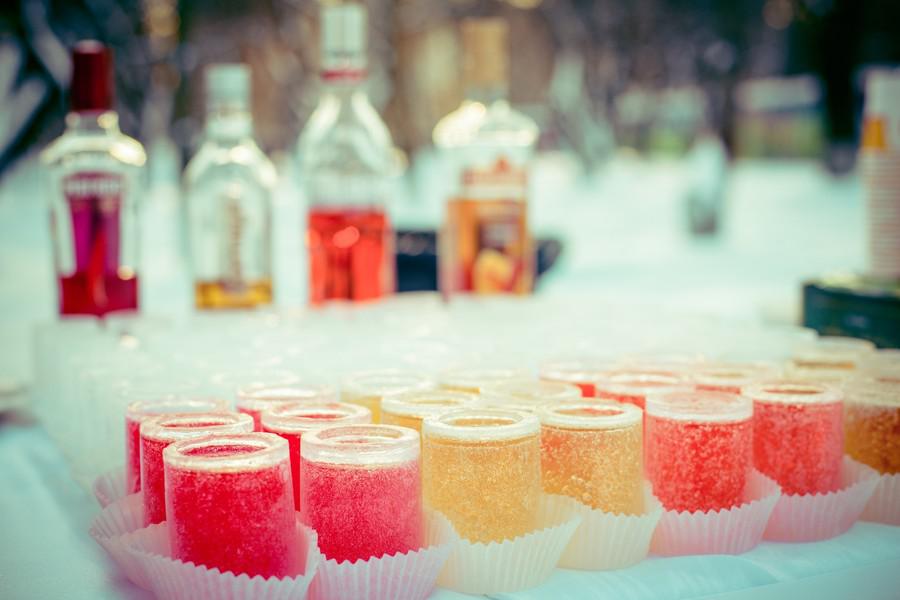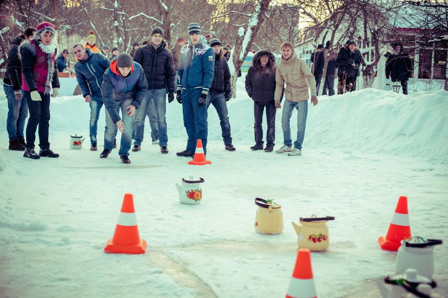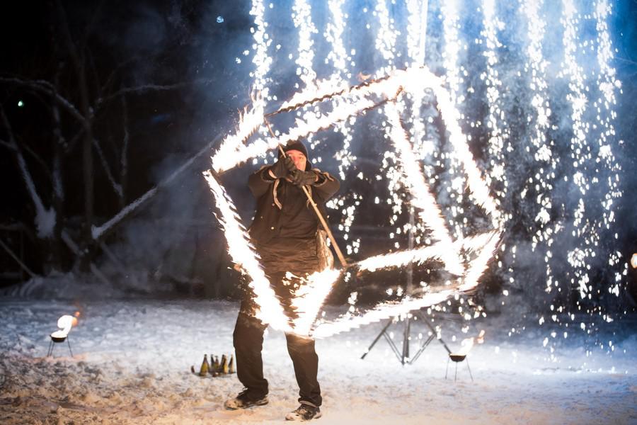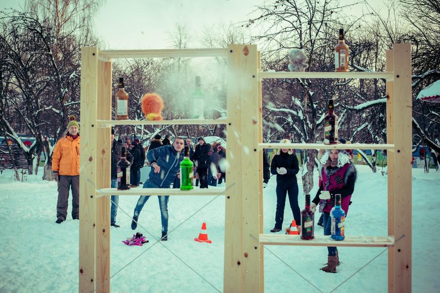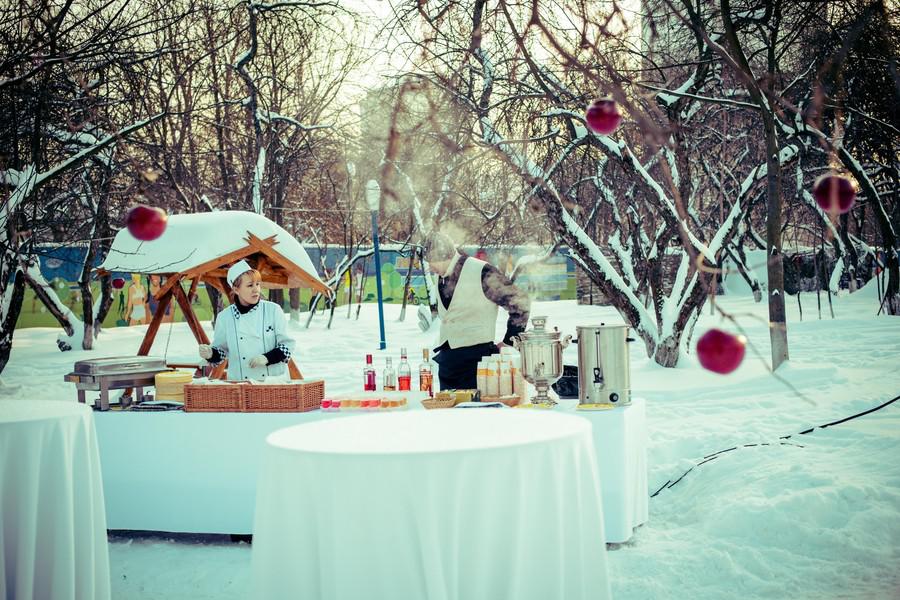Программа мероприятия состояла из двух частей: уличной и банкетной. Для уличной части мы подготовили целый набор аттракционов и активностей: "алкотир", керлинг чайниками, игры, бампербол, катание на тюбингах. Всеми активностями руководили наши аниматоры, для которых мы сделали потрясающие костюмы гномиков. Конечно же, для уличной части был подготовлен специальный фуршетный стол: пирожки, блины и - яркий элемент - различные и разноцветные настойки в ледяных стопках, которые очень понравились всем гостям. Для антуражности и красоты мы развесили настоящие яблоки на деревья в "Яблоневом саду" - и это было настоящее чудо посреди зимы!