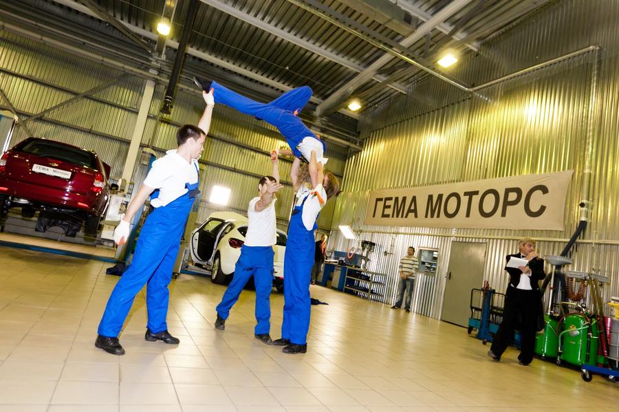 Сразу после торжественной части всех гостей пригласили на экскурсию в сервисную зону, где Генеральный директор автосалона рассказал о современном оснащении сервис-зоны и профессионализме своих механиков. Каково же было удивление гостей, когда механики автосалона, до этого крутившиеся возле автомобилей, вдруг начали танцевать и исполнили зажигательный акробатический танец прямо на глазах всех зрителей! Конечно же, это было специально подготовленное шоу, в котором приняли участие артисты замечательного шоу-балета Dance City!