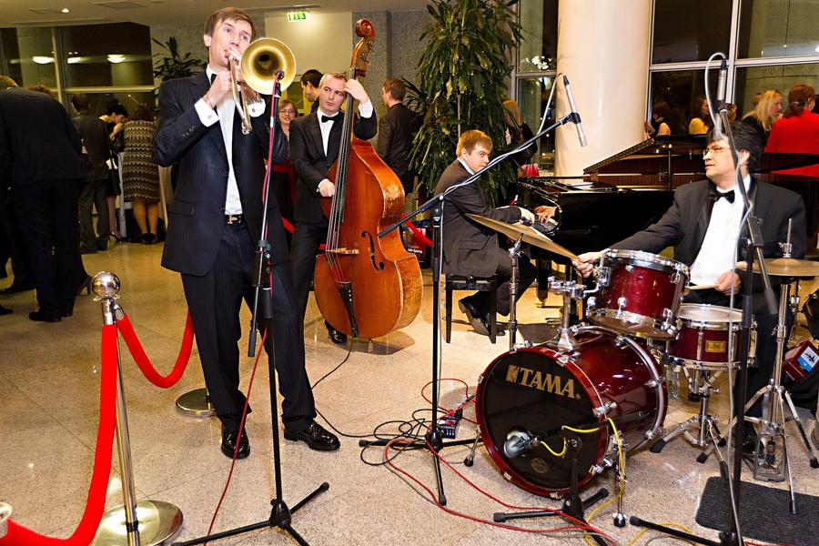 Сбор и регистрация гостей происходили в фойе ММДМ, под акомпанемент яркого джазз-квартета VisaJazz, исполнявшего не только салонную и джазовую классику, но и интересные импровизации и копозиции в собственных необычных аранжировках. Конечно же, как и должно быть светскому мероприятию, гостей угощали шампанским и легкими закусками, оставив основной фуршет на окончание Церемонии. Фойе было специальным образом украшено к мероприятию, а центральным элементом декора стала эксклюзивная конструкция, которой мы заменили традиционные бренд-волы.